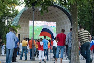На этой сцене когда-то выступал Гитлер. Сейчас здесь проводят бесплатные концерты или трансляции футбольных матчей. На фото: четвертьфинал Евро-2008 Россия-Голландия. Русские Висбадена болеют за своих ))